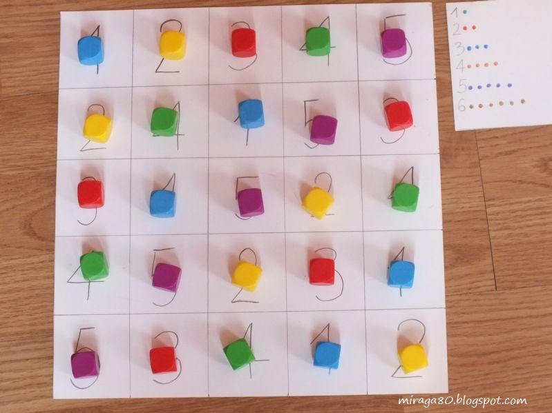 Zasady gry: Rzucamy kostką. Ile wypadnie oczek, na taką cyfrę kładziemy nasze klocki tak, aby zakryć wszystkie. Jeśli wypadnie 6 traktujemy to jako pudło, jeśli wyrzucimy cyfrę, która jest już zakryta, to oddajemy kostkę drugiemu graczowi. wygrywa osoba która jako pierwsza zasłoni wszystkie cyfry na swojej planszy.
